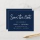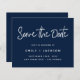 Guión de mano Minimalista elegante y moderno azul de la marina de presupuesto Guardar la postal del Boda de fecha. La tarjeta de invitación para guardar la fecha incluye una tipografía de escritura con letras a mano moderna con una moda y un diseño sencillo al que se puede añadir la imagen de fotografía de compromiso personalizada.