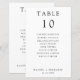 Tarjeta de número de tabla simple, minimalista, en blanco y negro, con una tabla de asientos con nombres de invitados.