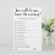 "¿Qué Tan Bien Conoce A Mamá?" ¿Quién mejor conoce a la futura madre? Una simple ducha de bebé o un juego de fiesta revelan sexo con un divertido y casual guión escrito a mano. El diseño clásico incluye un moderno superpuesto de tipografía con letras a mano. Para otros colores o productos a juego, por favor visite la tienda JustFharryn Zazzle, o contacte con el diseñador, c/o Fharryn@yahoo.com Todos los derechos reservados. #bohochic #zazzlemade