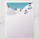 Ilustracion gráfico en invierno con dos lindos hombres de nieve haciendo snowboard en un ambiente nevado.