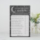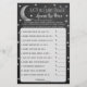 Este juego "sobre la luna" es perfecto para cualquiera que tenga una ducha de bebé este año. El diseño presenta una luna de plata con estrellas en un fondo de efecto de pizarra y un texto de plantilla fácil de personalizar. Solo tienes que dar estas cartas de juego a tus clientes para que jueguen en la ducha, el que esté más cerca del coste total real, sin pasar por aquí, gana un premio de tu elección.