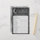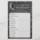 Este juego "sobre la luna" es perfecto para cualquiera que tenga una ducha de bebé este año. El diseño presenta una luna de plata con estrellas en un fondo de efecto de pizarra y un texto de plantilla fácil de personalizar. Simplemente dé estas fichas de juego a sus invitados para que jueguen en la ducha, quien primero descifra las palabras, gana un premio de su elección. Respuestas: 1) Papeles 2) Baby Shower 3) Tejidos 4) Enfermería 5) Cinta 6) Pacificador 7) Una-sie 8) Composición 9) Actividad Mat 10) Grupo 11) Bassinet 12) Frasco 13) Batería
