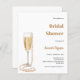 Una invitación moderna, elegante y glamurosa para una ducha de perlas y de novias Prosecco. Un fondo blanco con un vaso, flauta con burbujas doradas y perlas. El nombre está escrito con una escritura de estilo con letras a mano moderna. Personalice y agregue los detalles de su fiesta. 1 hoja = 1 borde impreso de invitación al borde.