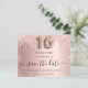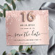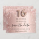 Una chica y de moda Salva la tarjeta de fecha para una dulce fiesta de 16 años. Rosa dorado falso fondo metálico decorado con oro rosa y purpurinas de plata falsa goteo y polvo. Personalice y agregue una fecha y un nombre/texto. El texto: Save the Date se escribe con un gran guión de estilo con letras a mano y a la moda con guiones. Número 16 con un tipo de letra de estilo globo.