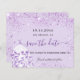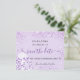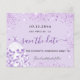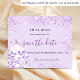 Una chica y de moda Salva la tarjeta de fecha para una dulce fiesta de 16 años. Fondo violeta de color lavanda decorado con un polvo falso purpurina y un vestido. Personalice y agregue una fecha y un nombre/edad. Letras negras y violetas. El texto: Save the Date se escribe con un gran guión de estilo escrito a mano.
