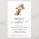 Presupuesto, Moderno, Elegante, Moda Floral Heels Dorado Dulce 16 Invitación de fiesta de cumpleaños con nuestro brillante y glamoroso talón dorado de color agua rodeado de flores tropicales rosas y verdes. El fondo es un lujoso lavabo de color acuático dorado. Fácil de personalizar con su información para una simple y elegante invitación de fiesta de cumpleaños. **Nuestro documento de PRESUPUESTO es más pequeño y delicado, pero todavía hermoso!** Para una comparación de tipos de papel, por favor vea nuestro video aquí: https://youtu.be/G0F9Am5HPD4 Si necesita ayuda o artículos coincidentes, por favor contáctenos en cedarandstring@gmail.com.