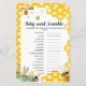 La temática de las abejas tiene un diseño de abejas amarillas, una tarjeta de texto para niños. Las palabras de esta tarjeta están relacionadas con los bebés y han sido revueltas. Los clientes competirán para ver quién los puede descifrar primero. CLAVE DE RESPUESTA: 1. LULLABY ; 2. Leche 3. MÓVIL 4. El quinto elemento es una mecedora de pañales. 7. vivero 8. monitor para bebés; 9. compartimento 10. WIPES. 11. BLANKET 12. 13. ESPADA. 14. 15. CRIB.
