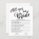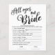 Haga que su ducha de novia sea divertida y memorable con el juego de ducha simple de novia All Eyes on Bride. Este entretenido juego interactivo está diseñado para traer risas, alegría y un poco de competencia amistosa a su celebración. El juego "All Eyes on Bride" (Todos los ojos en la novia) anima a los invitados a centrarse en la novia, contestar preguntas o realizar tareas que giran en torno a ella. Es un perfecto rompehielos que une a todos. Las instrucciones fáciles de seguir hacen que este juego sea adecuado para todas las edades. No hay reglas complicadas, sólo diversión directa que todos puedan disfrutar. Las tarjetas de juego tienen un diseño limpio y elegante que complementa cualquier tema de la ducha de novia. Los colores suaves y femeninos y la tipografía de buen gusto le dan un toque de sofisticación a su evento.