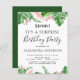 Palmeras Tropicales Ecológicas Ecológicas y Flores Florales Rosadas de Rubor Shhh ... Invitaciones sorpresa a la fiesta de cumpleaños con fondo verde que incluye una tipografía de escritura hermosa y elegante con flores modernas de color rosa rosa rubor botánico y vegetación tropical hawaiana.