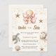 Celebrate your little mermaid on the way with this adorable Under the Sea baby shower invitation, featuring a sweet watercolor octopus holding a baby bottle surrounded by seashells, starfish, and bubbles.