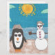 Un muñeco de nieve y un pingüino se van de vacaciones a la playa.