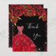 Una tarjeta de agradecimiento de cumpleaños femenina y elegante. Un fondo negro, con purpurina falsa roja, destellos, rosas rojas y un vestido rojo. En la parte delantera un gran texto manuscrito y el texto: Gracias.