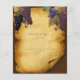Menú Boda de viñedos. Fondo de papel antiguo con bordes curvados y rotos sobre un fondo burdeos profundo. Bonito morada y acentos de vid de uva azul.