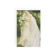 This image portrays an elegant bride standing gracefully in a lush, sunlit garden. She wears an ivory wedding gown adorned with delicate lace, subtle beading, and a softly gathered waist accentuated by a jeweled brooch. A long, translucent veil cascades behind her, catching the light and adding a sense of movement and ethereal beauty. The bride gazes gently downward at a cascading bouquet of white lilies and greenery, her expression calm and contemplative. Surrounded by dense foliage and tall trees rendered in soft, painterly tones, the scene evokes a romantic, timeless atmosphere inspired by classical illustration and Art Nouveau aesthetics.