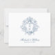 Trae elegancia de regenciycore a su planificación boda con esta sofisticada tarjeta RSVP de doble cara. El frente cuenta con un intrincado escudo inspirado en Regency, con detalles florales, combinado con un elegante guión azul y una tipografía sísmica, lo que da un tono de refinamiento eterno. En la parte trasera se encuentra una zona de respuesta bien organizada, decorada con flores, que permite a los clientes responder con facilidad manteniendo la estética lujosa de la tarjeta. Opcionalmente incluye opciones de comida y espacio para cualquier restricción alimenticia. Perfecto para parejas que abrazan la opulencia y el encanto de la época Regency, esta tarjeta RSVP ofrece una perfecta combinación de funcionalidad y un exquisito diseño para complementar su día especial.