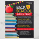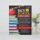 De vuelta a la escuela, el volante de recaudación de fondos incluye una variedad de libros coloridos apilados, una manzana roja y un banner de puntos polka rojo y amarillo en un fondo de pizarra.