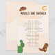 ¡Sí! Haz que tus invitados se rían y adivinen con nuestro juego de ducha de bebé de inspiración occidental, "Will She Bains". Con juguetones de gorra de vaquero y diseños de cactus, este juego le dará un giro divertido a su celebración. Ver quién conoce mejor a la futura mamita mientras responde preguntas divertidas y perspicaces.
