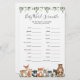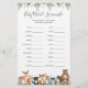 La tarjeta de juego con temática de animales de bosque para bebés ducha palabra scramble cuenta con una acuarela de ilustracion de animales de bosque y vegetación de color agua eucalipto garland y elegante fuente de estilo manuscrito.