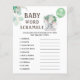 Añade risas y alegría a tu Baby Shower con nuestro "Word Scramble" | ¡Baby Shower con globo verde elefante!". Los clientes se divertirán mucho completando la lista de palabras de esta tarjeta, todas relacionadas con los bebés, que primero pueden desarmarlos. ¡Consigue el tuyo hoy y crea recuerdos inolvidables! Solución: 1. fórmula 2.pacifer 3.baby monitor 4.rocking chair 5.swaddle 6.diaper raffle 7.caucho ducky 8.stroller 9.playpen 10.eosines