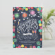 Una invitación de fiesta de verano, con letras a mano y puntos y lampions coloridos alrededor