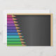 Este diseño es lápices en una pizarra. Tiene una pila de lápices de colores a un lado y una pizarra al fondo. Estos lápices en un diseño de pizarra se ven muy bien en estas invitaciones