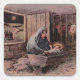 Imagen vintage de la escena de la Natividad con la Madre Bendita, el niño Jesús, las vacas, el pesebre y los tres Sabios afuera de la ventana. La estrella brilla a lo lejos. Reimpreso como estos hermosos stickers de Navidad.