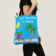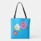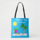 Las bolsas de asas personalizadas alegres tropicales personalizadas de la playa con SU TEXTO o cancelación. Escena alegre de la playa en un lado y las flores hawaianas en el otro lado. El color bonito de las bolsas de asas de la turquesa se puede cambiar a CUALQUIER fondo y texto del COLOR.