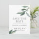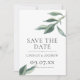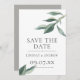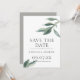 Una invitación de fecha limpia, elegante y moderna, con hojas de acuarela verde detalladas sobre un fondo blanco y un elegante texto gris oscuro. El reverso está en gris sólido.