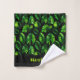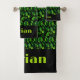 Unas hojas verdes tropicales grandes que se asemejan al follaje de Monstera sobre un fondo negro crean un bonito conjunto de toallas de baño. Personaliza tu nombre con un texto verde brillante sobre un fondo negro.