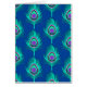 Tarjeta de nota en una huella textil de plumas de pavo real - plumas acuáticas claras, con un ojo en tonos violeta morado con agua y negro, sobre un fondo azul cobalto profundo