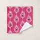 Toalla colocada en una tela de plumas de plumas de pavo real de plumas rosa pastel, con un ojo en tonos fucsia, burdeos, rosa de coral y negro, sobre un fondo rosa fucsia profundo