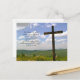 Postales de Pascua con escritura y una foto cruzada de madera. La escritura en el frente es del libro de Luke y se puede cambiar. Ponga la información de los servicios de Pascua en la parte trasera y utilice para invitar a los participantes. Fotografía de una cruz en una colina fue tomada en Bristol, New Hampshire.