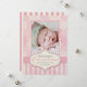 Envíe la primera foto de Navidad de su bebé en este hermoso diseño de tarjetas de felicitación de Navidades rosados y crema con copos de nieve, rayas rosas y las palabras "Feliz Navidad" en un guión elegante. Se muestra en papel de hielo metálico. Reemplace la foto de ejemplo con la suya propia y agregue sus nombres. Necesita ayuda para personalizar el contacto luxuryweddinginvitations@gmail.com