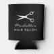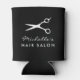 Enfriador de lata con nombre de salón de belleza personalizado para estilista de cabello. Elegante soporte para bebidas en negro y blanco con logotipo de tijeras de peluquero. Color de fondo personalizable. Impresión a doble cara. Agregue su nombre personalizado, nombre comercial, eslogan de la empresa, etc. Idea de regalo adorable para empleados, clientes, clientes, amigos, familiares, personal, etc.