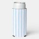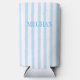 Mantenga las bebidas frías con estilo con este enfriador de latas delgado de franja azul personalizado. Con franjas verticales suaves de color azul claro y blanco con un nombre personalizado en la parte delantera, este soporte de lata delgado es perfecto para viajes a la playa, días de piscina, despedidas de soltera, fiestas de novia y fines de semana de chicas.