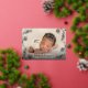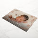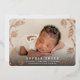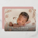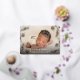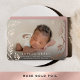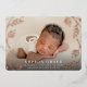 Las elegantes tarjetas de anuncio de nacimiento presentan una foto horizontal o horizontal con una capa completa de hojas de laurel en Relieve metalizado de oro rosa. Personalice con el nombre del bebé, las estadísticas de nacimiento y una firma familiar con letras blancas y añada tres fotos adicionales a la parte posterior.