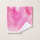 Lavado moderno con acuarela de hojas de arce rosa caliente y toalla de baño monograma. La toalla de baño tiene un borde de hojas de arce blancas sobre un lavado de color rosa y su monograma en un marco con un contorno colocado en el centro. La toalla de mano muestra un patrón de hojas de arce y el paño de lavado está cubierto con salpicaduras de color rosa.