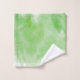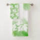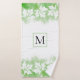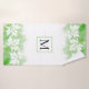 Lavado moderno de color verde de la hoja de arce blanco y conjunto monograma de toallas de baño. La toalla de baño tiene un borde de hojas de arce blancas sobre un lavado de color verde y su monograma en un marco con un contorno colocado en el centro. La toalla de mano muestra un patrón de hojas de arce y el paño de lavado está cubierto con salpicaduras de color verde.