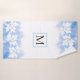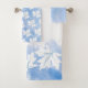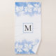Hojas de arce blancas modernas en el lavado de color azul y toallas de baño monograma. La toalla de baño tiene un borde de hojas de arce blancas sobre el agua azul cielo y su monograma en un marco con contorno colocado en el centro. La toalla de mano muestra un patrón de hojas de arce y el paño de lavado está cubierto con salpicaduras de color azul.