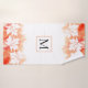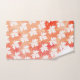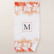 Lavado de color de la hoja de arce de coral moderno y toalla de baño monograma. La toalla de baño tiene un borde de hojas de arce blancas en el lavado de color de coral vivo y su monograma en un marco con contorno colocado en el centro. La toalla de mano muestra un patrón de hojas de arce y el paño de lavado está cubierto con salpicaduras de color coral.