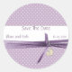 Lavender salpicted swiss salva la fecha pegatina. Decorado con cinta de satén morada y encanto cardíaco. Personaliza con tu propia información.