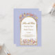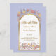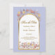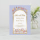 Elegante diseño moderno y colorido de jardín de flores silvestres en tonos lavanda, amarillo y melocotón con arco dorado sobre fondo perwinkle y tipografía elegante con monograma en la parte posterior. Tan romántico y floral para ese día especial de tu vida.