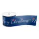 Texto del saludo de la Navidad de los Cerezos Blancos con gorra rojo, árbol verde y chispas blancas en un fondo azul. Se puede cambiar el color de fondo.