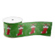 Esta banda de cinta es verde con un patrón de remolino y una imagen repetida de un Navidad rojo y blanco que se abastece con un gnomo blanco con barba y latas de dulces en la parte superior de la población.