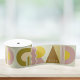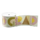 Retro-style graduation gift wrapping ribbon that features the word "GRAD" designed with geometric shapes in various colors. Retro colors—yellow, pink, brown, and green—add to the retro style.
