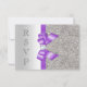 Tarjetas de respuesta personalizadas para boda / invitaciones planas. Elegantes tarjetas de respuesta dobles personalizadas de color plata y lavanda con un hermoso patrón brillante de lentejuelas impresas, gráficos brillantes impresos de lazos y cintas vectoriales y diamantes de imagen impresa con estilo, brillantes joyas y fuente morada. Estas elegantes y glamurosas, de moda, vibrantes, lilas, lavanda, moradas y plateadas respuestas están decoradas en ambos lados. Hermosas, chic, modernas y elegantes tarjetas dobles con brillo y glamour. Tenga en cuenta: Todas las invitaciones en Zazzle tienen gráficos impresos planos, no lazos, joyas o lentejuelas reales. Tengo productos a juego para bodas en mi tienda. El texto, la fuente y los colores de la fuente son personalizables para satisfacer sus necesidades. Si necesita ayuda para personalizar su producto, por favor contácteme a través de mi tienda. Estaré encantado de ayudar.