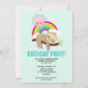 Invitación de cumpleaños con un ilustracion con un lindo lazo marrón que felizmente relaja en una rama de árbol. Un arcoíris colorido detrás de él junto con un sol rosado sobrevolando la cabeza. Agradable, adorable y de moda.