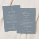 Estas cartas e itinerarios mínimos de bienvenida azul y blanco son perfectas para una boda elegante. El diseño presenta una sencilla silueta de vegetación blanca sobre un polvoriento fondo azul con un estilo minimalista clásico. La parte delantera de la tarjeta incluye una carta de bienvenida y la parte trasera de la tarjeta incluye el itinerario del boda. Estas notas son perfectas para bodas de destino y bolsos de bienvenida para huéspedes del hotel.