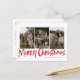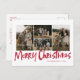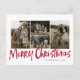 La tarjeta postal Red Modern Lettering Five Photo Merry Christmas contiene cuatro fotos en la parte delantera y espacio para tu mensaje más largo en la parte posterior.