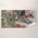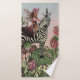 Un ilustracion mágico pintado a mano de un hada africana montando un unicornio de cebra en un safari floral a través de un jardín de hermosas proteínas y flores de dietes gradiflora.